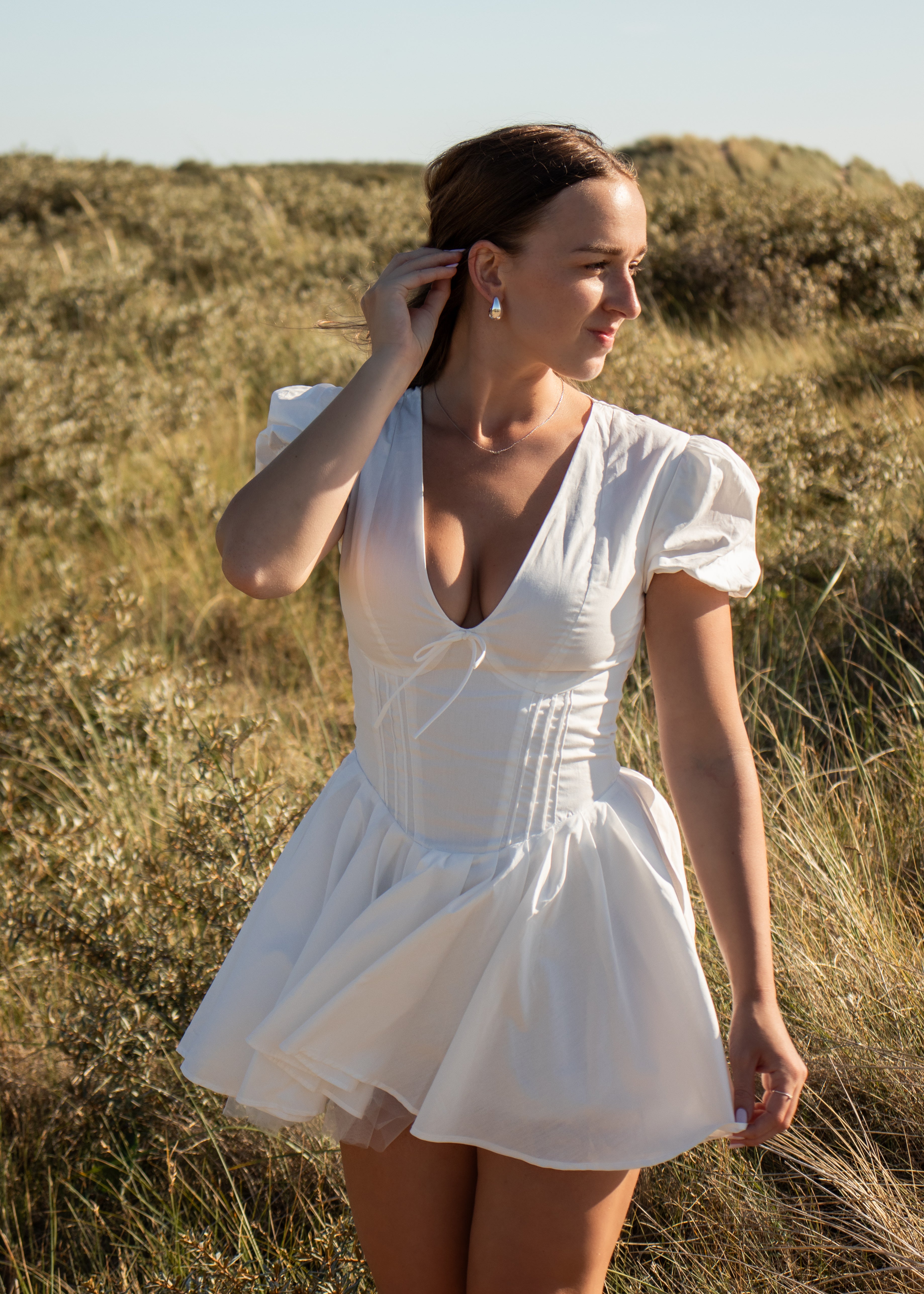 Dit is de jurk voor het zomerseizoen! Met de diep witte kleur en de romantische a-lijn vorm ben jij klaar voor de romantische date night avondjes en een gezellige picknick met de meiden! De uitgesneden halslijn accentueert de vrouwelijkheid met een mooi strikdetail. De pofmouwen maken de jurk uniek, en geplooide volumineuze rok maakt de jurk af. En vergeet het corset lijfje niet, deze accentueert de taille en maakt de jurk extra féminine.
