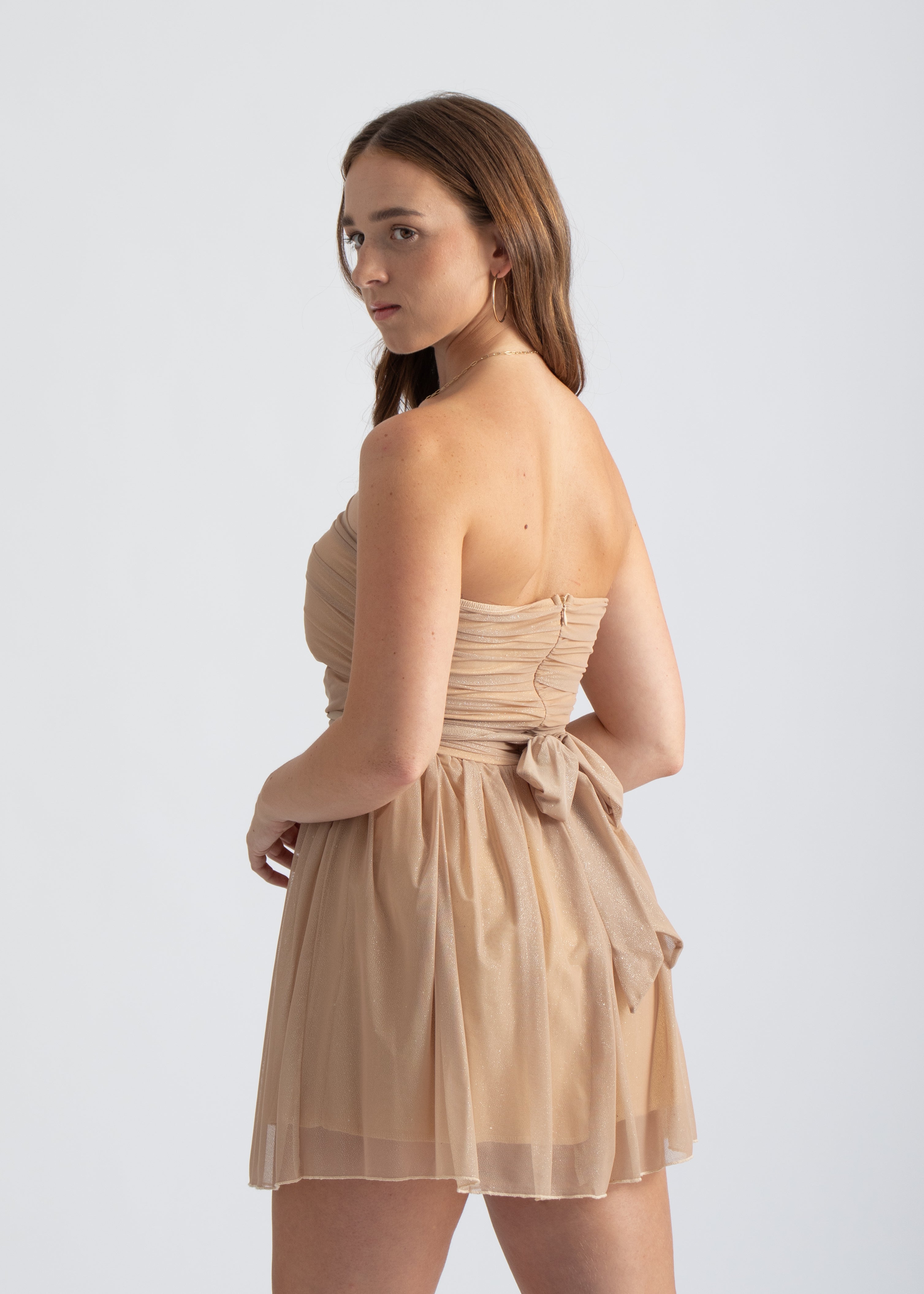 Time to sparkle girls! Een klassieke jurk met een lichte glitter is perfect voor date nights, feestjes en gala's. De band strik je om het lijfje heen en kan gestrikt worden aan de achterkant voor een elegant detail. De stof is erg rekbaar en is dubbel gelaagd zodat deze niet doorschijnt.
